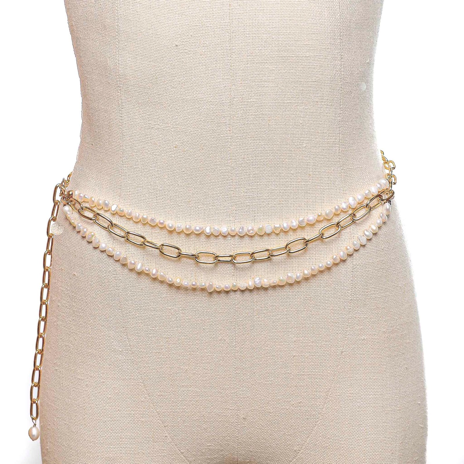 Cinturón y collar de chapa de oro de 18k con cadena de extensión de 8 cm para cuello y 10 cm para cintura, con perlas cultivadas naturales de 6mm de diámetro. Disponible en 3 tallas: CH, MED y G. Hecho a mano.